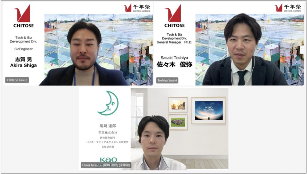 At MATSURI, we pursue an open innovation strategy in which we share the results and challenges of joint research conducted individually with each partner at information sharing meetings with our partners, and then consider and create development themes to advance our research. This time, as a case study of joint research, an online information sharing session was held together with Kao Corporation (hereinafter referred to as Kao), an industry development partner, with 100 people from 57 companies participating.
