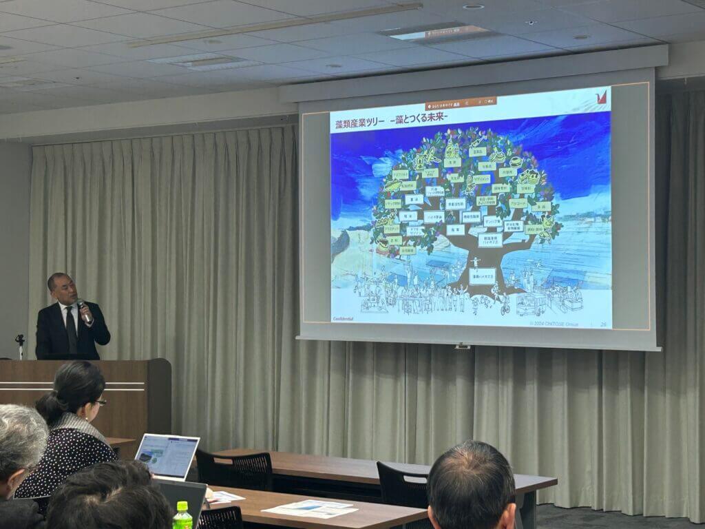 藤田より「2030年までに4000兆円の市場規模到達?!バイオエコノミーの潮流とちとせグループの戦略」と題し、当グループのバイオエコノミー実装への取り組みや、光合成基点の社会構築のために藻類を活用する意義などについてお話させていただきました。講演は実会場とオンライン合わせ約200名以上の方にご聴講いただきました。