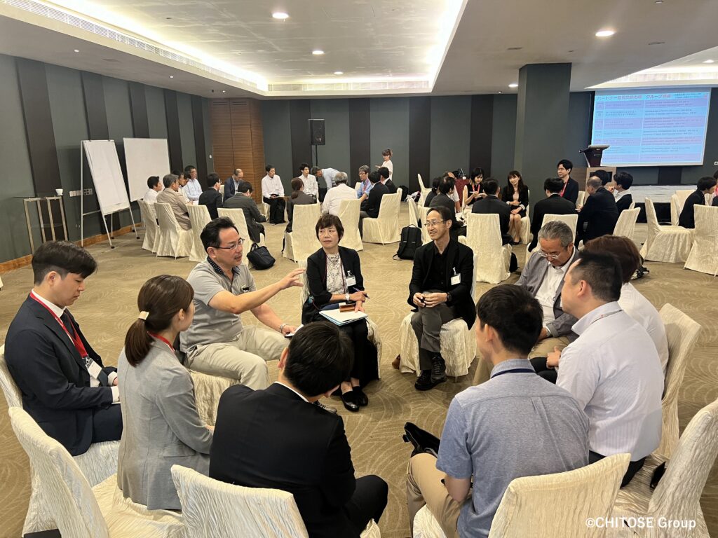 2日目午前、ちとせ研究所 サラワク支店 支店長 伊香亮、ちとせグループ Chief BioEngineer 星野孝仁、日本ガイシ株式会社 代表取締役副社長 丹羽智明様による講演と、35社+ちとせメンバーを交えた意見交換会が行われました。意見交換会では、各業界について、MATSURI企業間連携について、設備や現場仕事についてなど、7つのテーマごとに中心人物を据えて車座になり、参加者が興味のある輪に加わって意見や疑問を互いにぶつけ合いました。企業という枠組みを越えて真剣な議論が交わされ、制限時間が足りないという声も聞こえてくるほどの白熱ぶりでした。